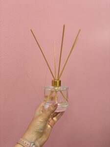 - All materials needed to create your reed diffuser, including the bottle, fragrance oils, lid and reed sticks.